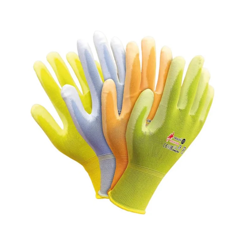 Rękawice ochronne z nylonu, powlekane poliuretanem RPOLICOLOR marki REIS w jaskrawych kolorach, z linii DRAGON