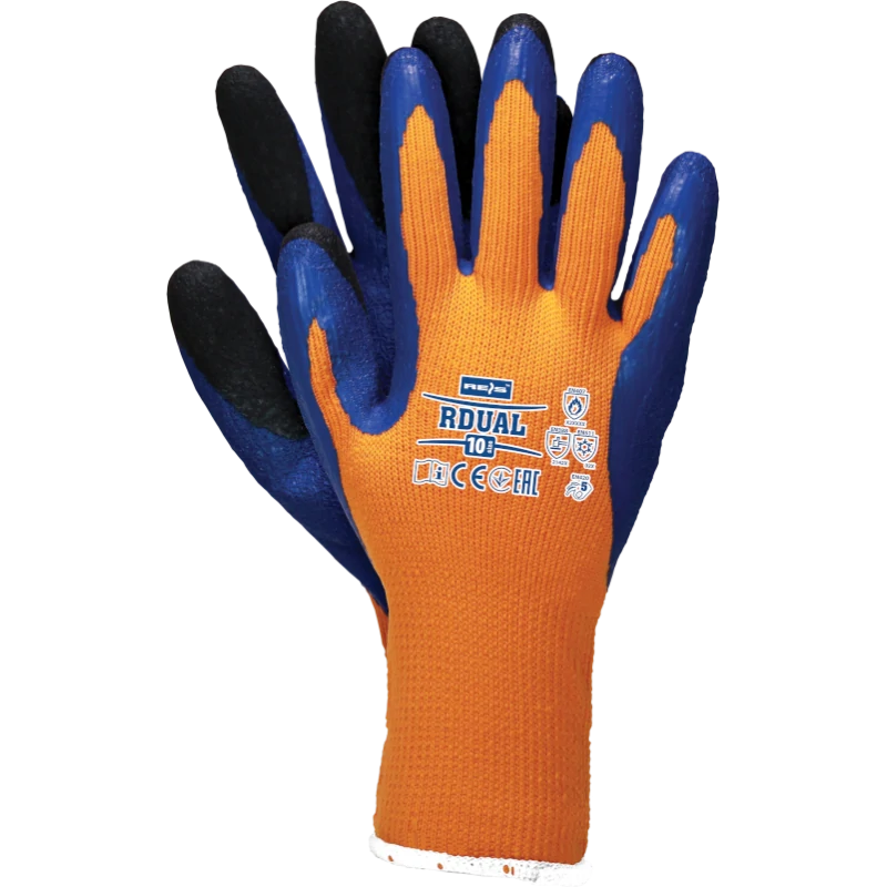 Rękawice robocze ocieplane, powlekane gumą RDUAL marki REIS w kolorze pomarańczowo-niebiesko-czarnym