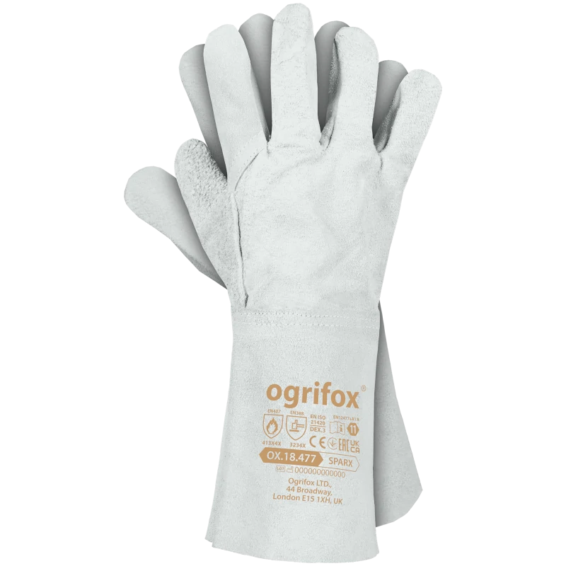 Rękawice ochronne spawalnicze, skórzane OX.18.477 SPARX marki OGRIFOX w kolorze jasnoszarym