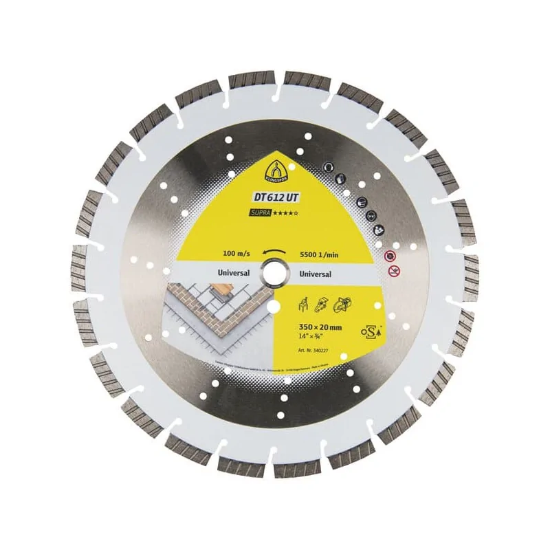 DT 612 UT Supra to profesjonalna tarcza diamentowa przeznaczona do cięcia szerokiej gamy materiałów budowlanych, betonu – także starego i zbrojonego – oraz piaskowca wapiennego. Dzięki segmentom turbo o wysokości 12 mm oraz konstrukcji spawanej laserowo zapewnia bardzo szybkie cięcie, wysoką agresywność i wyjątkową trwałość.