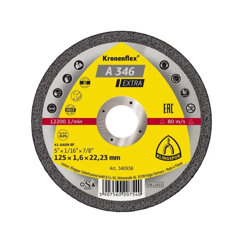 Tarcze A346 Extra wyróżniają się doskonałym stosunkiem ceny do jakości. Znajdują zastosowanie m.in. przy obróbce stali, stali nierdzewnej i aluminium. Ściernice są bardzo cienkie, dzięki czemu nadają się doskonale w szczególności do cięcia bez gratu rur ze stali szlachetnej, profili cienkościennych, blach, zapewniając niewielkie obciążenie termiczne obrabianego przedmiotu i ściernicy oraz niewielki zadzior po cięciu. Ściernice A346 z linii Extra marki Klingspor są stosunkowo twarde, dzięki czemu zapewniają długą żywotność i wysoką agresywność. Optymalną wydajność tarczy osiąga się przy zastosowaniu maksymalnej prędkości obrotowej.