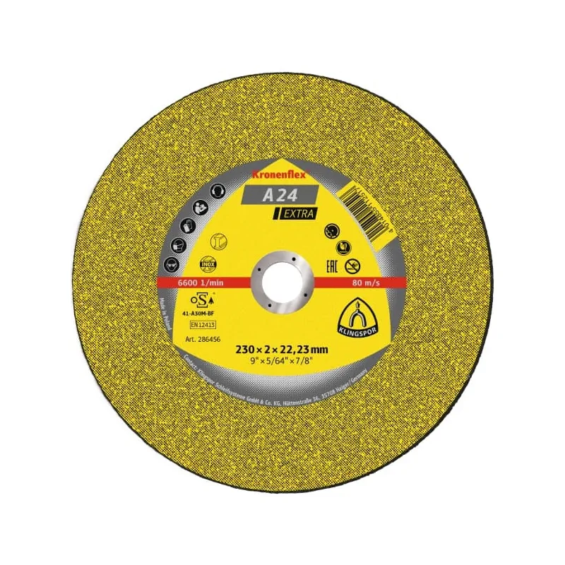 Tarcze A24EX wyróżniają się szybkim cięciem, przy zachowaniu niskiej ceny. Znajdują zastosowanie w obróbce metalu, cięciu rur oraz prętów, płaskowników czy profili zamkniętych. Ściernice przeznaczona do pracy z większością metali. Średnia twardość produktu gwarantuje czyste cięcie przy niewielkim nakładzie siły. Tarcze A24 Extra doskonale sprawdzą się podczas prac budowlanych, ślusarstwie, budowie urządzeń, produkcji metalowej, majsterkowaniu czy napraw w warsztacie. Optymalną wydajność tarczy osiąga się przy zastosowaniu maksymalnej prędkości obrotowej.