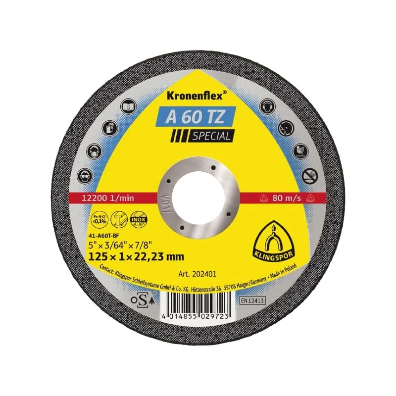 Tarcze A60 TZ Special są wyjątkowo cienkie, ale zapewniają długą żywotność i wysoką agresywność. Ściernice te polecane są w szczególności do cięcia blach, cienkich rur lub profili cienkościennych wykonanych ze stali nierdzewnej, stali i metali nieżelaznych (INOX). Tarcze znajdują zastosowanie głównie do konserwacji i napraw w zakładach produkcyjnych, przy budowie maszyn i konstrukcji stalowych. Nie zawierają siarki, żelaza ani chloru. Tarcze do cięcia stali Kronenflex zapewniają szybkie cięcie, minimalizują powstawanie zadziorów i obciążenie termiczne obrabianego materiału i ściernicy oraz brak gratu. Ściernice A60 TZ z linii Special marki Klingspor są produktami do profesjonalnych, specjalnych zastosowań. Zapewniają długą żywotność oraz doskonałą efektywność.