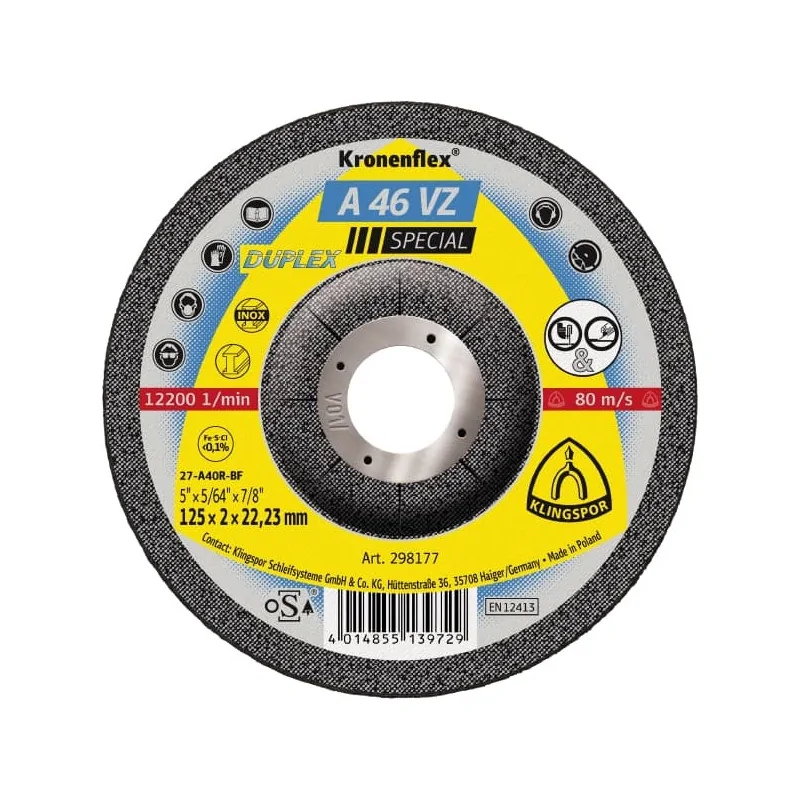 Tarcze A46VZ są produktem marki Klingspor zaprojektowanym do wymagających zastosowań. Wyróżniają się wysoką twardością i agresywnością. Tarcze A 46 VZ dzięki zastosowaniu specjalnej mieszanki doskonale sprawdzają się podczas cięcia jak i podczas lekkiego szlifowania. Uniwersalność ściernicy pozwala na lepsze wykorzystanie czasu pracy bez częstej wymiany narzędzia. Tarcze używane są podczas produkcji stalowej, budowie hal i magazynów, w ślusarniach, przy budowie maszyn i zbiorników, produkcji balustrad oraz przez hobbystów w przydomowych warsztatach. Produkt jest doskonałym wyborem, jeżeli chodzi o cięcie i szlifowanie blach, profili, płaskowników, rur. Ściernica do zastosowania w standardowych szlifierkach kątowych. Wysoka wydajność zadowoli nawet najbardziej wymagających profesjonalistów. Optymalną wydajność tarczy osiąga się przy zastosowaniu maksymalnej prędkości obrotowej.