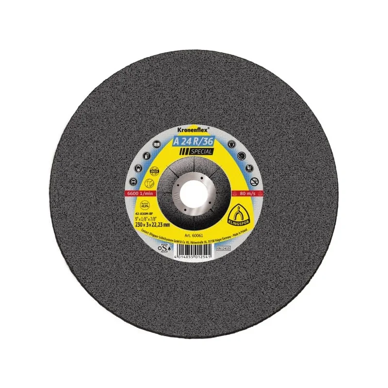 Tarcze A24R/36 są produktem marki Klingspor zaprojektowanym do stosowania w przemyśle nuklearnym. Wyróżniają się wysoką wydajnością cięcia oraz długą żywotnością. Tarcze specjalne A 24 R/36 nie zawierają żelaza, siarki oraz chloru. Ściernice używane są podczas produkcji stalowej, budowie hal i magazynów, w ślusarniach, w przemyśle jądrowym, przy konserwacjach oraz przez hobbystów w przydomowych warsztatach. Produkt jest doskonałym wyborem, jeżeli chodzi o cięcie blach, profili, płaskowników, rur. Ściernica do zastosowania w standardowych szlifierkach kątowych. Wysoka wydajność zadowoli nawet najbardziej wymagających profesjonalistów. Optymalną wydajność tarczy osiąga się przy zastosowaniu maksymalnej prędkości obrotowej.