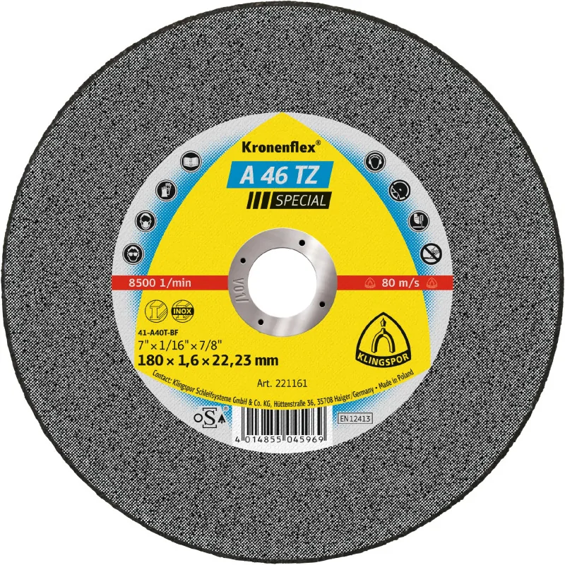 Tarcze A46 TZ Special zostały zaprojektowane do profesjonalnych i wymagających zastosowań związanych z cięciem stali czarnej i szlachetnej. Te tarcze do kątówki wyróżniają się wyjątkowo długą żywotnością i dużą agresywnością. Ściernice te polecane są w szczególności do cięcia stali czarnej i stali szlachetnej, głównie małych przekrojów. Nie zawierają siarki, żelaza ani chloru. Tarcze do cięcia stali Kronenflex są cienkie i zapewniają szybkie cięcie. Ściernice A46 TZ z linii Special marki Klingspor są produktami do profesjonalnych, specjalnych zastosowań. Zapewniają długą żywotność oraz doskonałą efektywność.