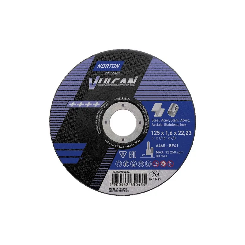 Vulcan A60S to produkt renomowanej firmy Norton - światowego lidera w produkcji narzędzi ściernych na świecie. Znajdują zastosowanie przy obróbce metalu, konstrukcjach stalowych, cięciu blach oraz rur ze stali szlachetnej czy profili cienkościennych. Charakteryzuje się długą żywotnością oraz doskonałym stosunkiem ceny do jakości. Ściernica nie zawiera chlorku, żelaza i siarki przez co nie zanieczyszcza stali nierdzewnej.