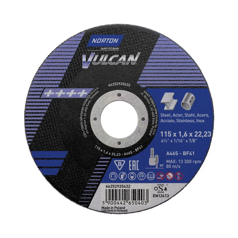 Vulcan A46S to produkt renomowanej firmy Norton - światowego lidera w produkcji narzędzi ściernych na świecie. Znajdują zastosowanie przy obróbce metalu, konstrukcjach stalowych, cięciu blach oraz rur ze stali szlachetnej czy profili cienkościennych. Charakteryzuje się długą żywotnością oraz doskonałym stosunkiem ceny do jakości. Ściernica nie zawiera chlorku, żelaza i siarki przez co nie zanieczyszcza stali nierdzewnej.