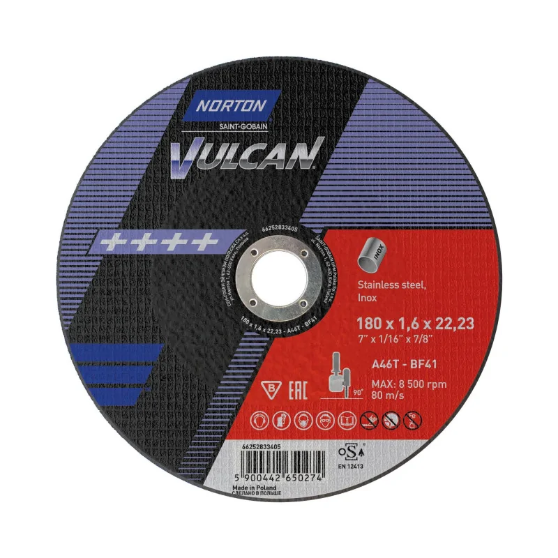Vulcan A46T to produkt renomowanej firmy Norton - światowego lidera w produkcji narzędzi ściernych na świecie. Znajduje zastosowanie przy konstrukcjach stalowych, cięciu rur ze stali szlachetnej czy profili cienkościennych. Doskonale sprawdza się przy cięciu średniej i twardej stali. Charakteryzuje się długą żywotnością oraz doskonałym stosunkiem ceny do jakości. Produkt doskonale sprawdza się w szlifierkach o niskiej mocy. Ściernica nie zawiera chlorku, żelaza i siarki przez co nie zanieczyszcza stali nierdzewnej.