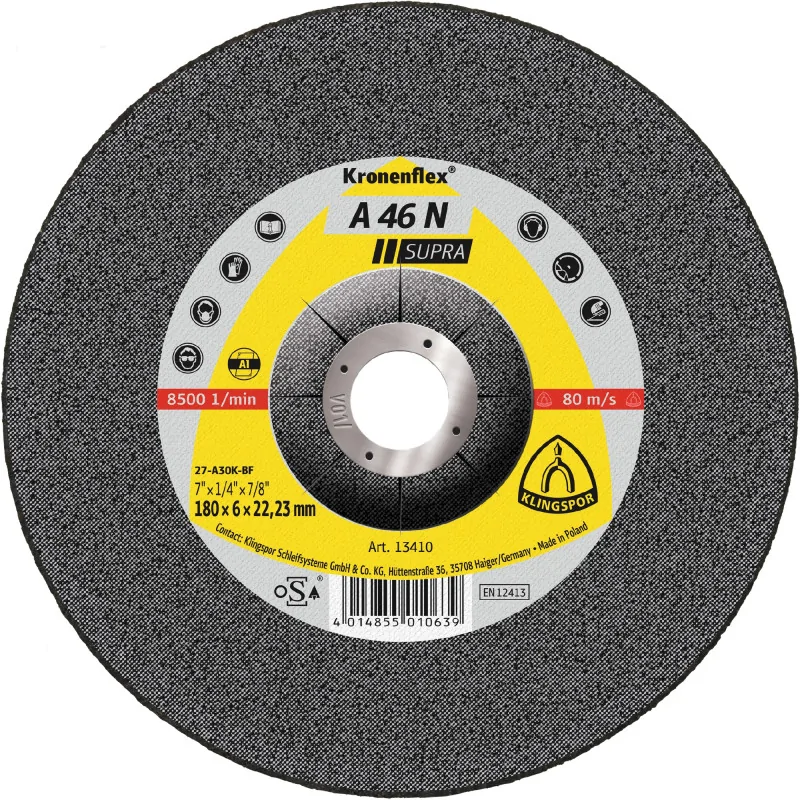 Tarcze A46N wyróżniają się specjalną mieszanką, która zapobiega zapychaniu się produktu. Znajdują zastosowanie w obróbce aluminium, szlifowaniu rur, płaskowników czy profili aluminiowych. Ściernice są grube, dzięki czemu niezwykle żywotne. Średnia twardość produktu gwarantuje czysty szlif przy niewielkim nakładzie siły. Tarcze A46N Supra doskonale sprawdzą się podczas prac budowlanych, produkcji okien i drzwi, budowie łodzi i statków, majsterkowaniu czy napraw w warsztacie. Optymalną wydajność tarczy osiąga się przy zastosowaniu maksymalnej prędkości obrotowej.