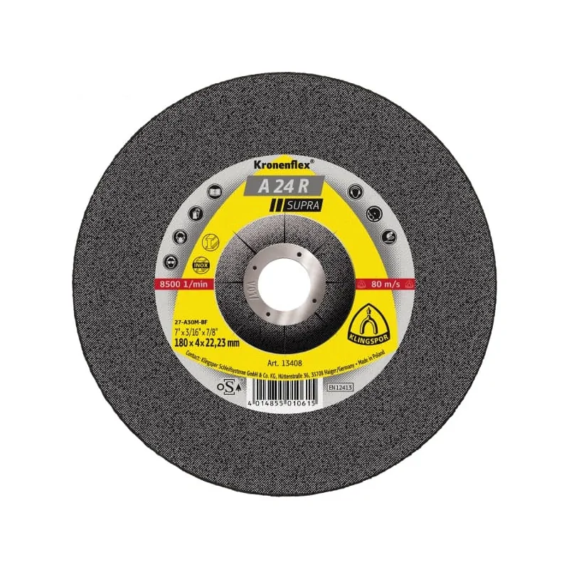 Tarcze A24R są produktem premium marki Klingspor. Wyróżniają się dużą twardością oraz bardzo wysoką żywotnością. Znajdują zastosowanie przy obróbce stali, szlifowaniu blach nierdzewnych, rur czy prętów. Ściernice dzięki zoptymalizowanej recepturze doskonale radzą sobie z obróbką stali. Duża twardość produktu gwarantuje agresywne szlifowanie przy niewielkim nakładzie siły. W przypadku szlifierek ręcznych bardzo ważnym aspektem jest stabilność produktu. Dlatego rdzeń tarczy jest twardy, jednocześnie elastyczny zapewniając tym doskonały komfort pracy. Tarcze A24 R Supra doskonale sprawdzą się podczas prac budowlanych, ślusarstwie, budowie urządzeń, produkcji metalowej, majsterkowaniu czy napraw w warsztacie. Optymalną wydajność tarczy osiąga się przy zastosowaniu maksymalnej prędkości obrotowej.