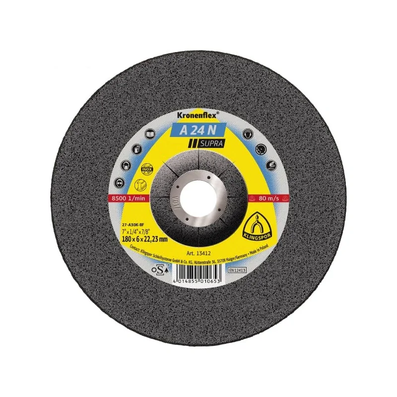 Tarcze A24N wyróżniają się doskonałą wydajnością, dzięki zastosowaniu ziaren tlenku glinu. Znajdują zastosowanie w obróbce stali nierdzewnej, szlifowaniu rur oraz prętów, płaskowników czy profili zamkniętych. Ściernice przeznaczona do pracy z większością stali oraz aluminium. Dzięki niskiemu poziomowi wibracji oraz bicia tarcze nadają się do szlifowania naroży i krawędzi, obróbki spawów czy usuwania gratu. A 24 N Supra charakteryzuje się wysoką agresywnością co gwarantuje czyste cięcie przy niewielkim nakładzie siły. Jako wzmocnienie zastosowano siatkę z włókna szklanego, przez co tarcze są stabilne i bardzo wytrzymałe. Optymalną wydajność tarczy osiąga się przy zastosowaniu maksymalnej prędkości obrotowej.